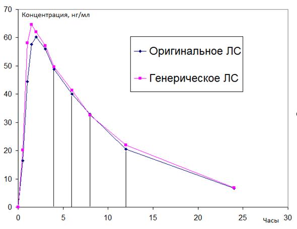 Препараты считаются биоэквивалентными, если: границы оцененного доверительного интервала для Смах, AUC (площади под фармакокинетичекой кривой), как для каждого добровольца, так и для усредненных результатов, находятся в пределах 80-125%;