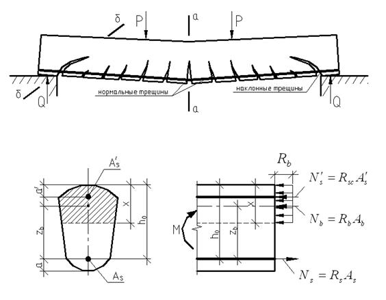 Рассмотрим однопролетную железобетонную балку (рис. 25), свободно лежащую на двух опорах, симметрично загруженную двумя сосредоточенными силами. На определенной ступени загружения в балке образуются нормальные и наклонные трещины, в соответствии с этим прочность изгибаемых элементов рассчитывают как по нормальным, так и по наклонным сечениям.