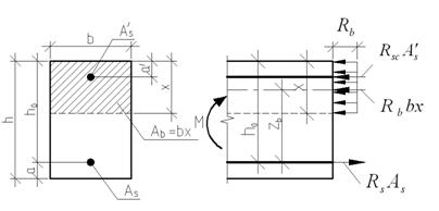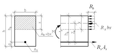 В бетоне сжатой зоны сложную криволинейную эпюру напряжений заменяют прямоугольной, т. е. напряжение в бетоне Rb принимают одинаковым по всей высоте сжатой зоны. При этом принимают, что бетон растянутой зоны не работает σbt = 0.