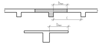 При большой ширине полок участки свесов, более удаленные от ребра, напряжены меньше. Поэтому в расчеты вводят только часть полки, участвующей в работе – не более половины расстояния в свету между ребрами c и не более 1/6 пролета рассматриваемого элемента (рис. 30, а).