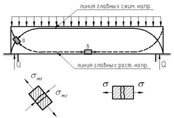 На приопорных участках под действием поперечной силы и изгибающего момента в сечениях, наклонных к продольной оси элемента, развиваются напряженно-деформированные состояния, как и в нормальных сечениях.