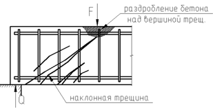 превысят сопротивление бетона растяжению Rbt, возникают наклонные трещины. Растягивающие усилия в наклонной трещине передаются на арматуру. При дальнейшем увеличении нагрузки наклонные трещины раскрываются, напряжения в арматуре доходят до предела текучести и происходит разрушение элемента вследствие раздробления бетона над вершиной наклонной трещины (рис. 37).