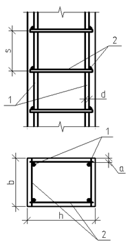 Поперечные стрежни предотвращают боковое выпучивание рабочих стержней. Расстояние между ними s должно быть при сварных каркасах не более 20d, при вязаных – 15d, но не более 500 мм (d – наименьший диаметр продольных сжатых стержней). Расстояние s округляют до 50 мм.