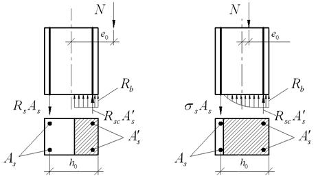 ). Внецентренно-сжатые элементы с большими эксцентриситетами продольной силы (рис. 45, а). Элемент ведет себя, как изгибаемый. Часть сечения растянута, имеет трещины, растягивающее усилие воспринимается арматурой. Часть сечения сжато вместе с арматурой. Разрушение начинается с достижения предела текучести в растянутой арматуре, завершается разрушением сжатой зоны бетона.