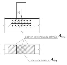 , Aloc1 – площадь смятия, Aloc2 – расчетная площадь смятия, включает участок, симметричный по отношению к площади смятия (схемы для определения Aloc2 приведены в СНиП 2.03.01-84* «Бетонные и железобетонные конструкции»).