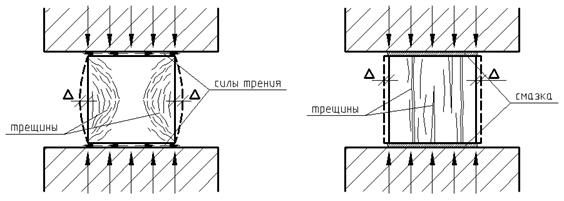 Если устранить силы трения смазкой контактных поверхностей, прочность бетонного куба будет меньше, поперечные деформации проявляются свободно, трещины разрыва становятся вертикальными. Временное сопротивление сжатию бетона для куба с ребром 150 мм равно R, с ребром 200 мм - 0,93 R, с ребром 100 мм – 1,1R. Это объясняется изменением эффекта обоймы с изменением размеров куба.