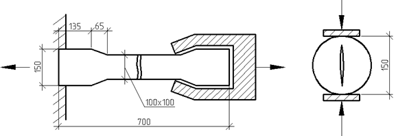 Прочность бетона на растяжение в 15…20 раз меньше, чем при сжатии. Повышение прочности бетона на растяжение может быть достигнуто увеличением расхода цемента, уменьшением В/Ц, применением щебня с шероховатой поверхностью. Временное сопротивление бетона осевому растяжению Rbt определяют испытаниями: