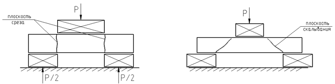 Рис. 5. Схемы испытания образцов на срез (а) и скалывание (б).
