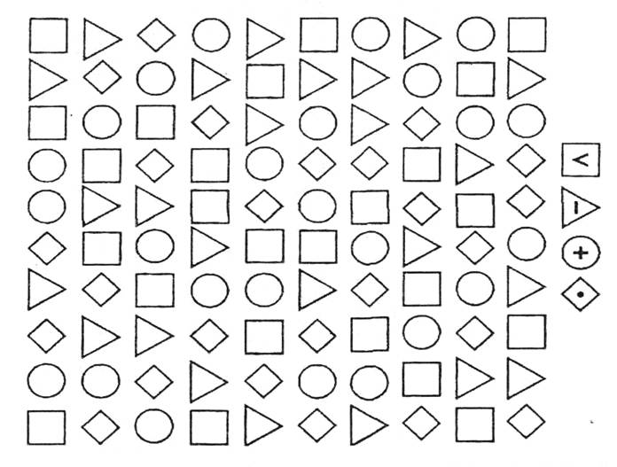 п — количество ошибок, допущенных во время выполнения задания. (Ошибками считаются неправильно проставленные знаки или пропущенные, т. е. не помеченные соответствующими знаками, геометрические фигуры.)