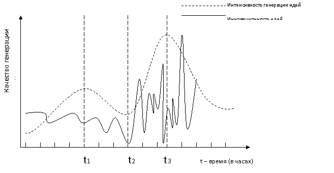 Нельзя принимать первую вершину (t1) как достижения, это всего лишь «интеллектуальный шлак», от которого очищаются участники работы, качество идей в этот период, как правило, ухудшается.