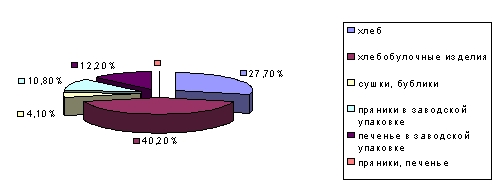За отчетный год увеличение доли по хлебу составило 2,1%; хлебобулочным изделиям - 0,8%; пряникам в заводской упаковке - 0,3%; печенью в заводской упаковке - 0,2%; пряникам, печенью - 0,3%. Следует отметить, что наибольший удельный вес из всех представленных товаров имеют хлеб (27,7%); хлебобулочные изделия (40,2%); печенье в заводской упаковке (12,2%); пряники в заводской упаковке (10,8%); а наименьший удельный вес - сушки, бублики (4,1%) и пряники, печенье (5,0%). Из структуры товарооборота хлебобулочных изделий мы видим, что преобладающее число потребителей предпочитает хлеб, хлебобулочные изделия, пряники, печенье и на последнем месте - сушки и бублики из-за дороговизны данного товара, а также большого ассортимента булочных и других изделий, которые пользуются у потребителей наибольшим спросом. Для наглядности покажем структуру товарооборота хлебобулочных изделий за 1999 год на рисунке.