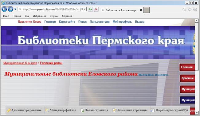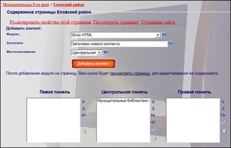 6. Информация на страницу добавляется в виде так называемых модулей – блоков, которые, создав однажды, можно потом размещать на нескольких страницах сайта одновременно. При этом изменения и дополнения, вносимые вами в сведениях о библиотеках вашего города (района), будут видны на всех страницах портала, где размещён этот модуль.