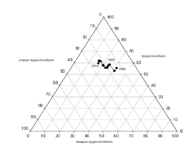 На рисунке 1 представлена траектория демографического развития Беларуси. Она дает представление о качественных демографических сдвигах, описанных ранее. На диаграмме изображен треугольник Гаусса, на котором показана возрастная структура населения. Стороны треугольника представляют собой шкалы, на которых откладываются значения долей возрастных групп (детей, трудоспособных и пенсионеров), общая сумма которых равна 100%. Белорусская траектория движения – левый нижний угол, т. е. рост населения старших возрастов на фоне низкой доли детей среди населения. Мы скатываемся в демографическую яму.