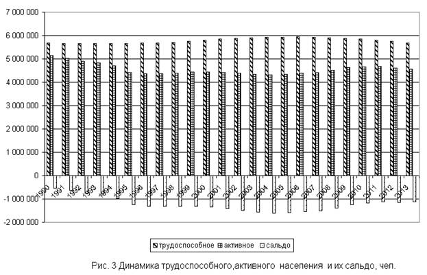 На рисунке 3 представлена динамика численности занятых и лиц трудоспособного возраста[4]. Выявляется любопытная картина, когда 10-20% трудоспособного населения официально не участвует в производстве товаров и оказании услуг. Да, есть учащиеся, военнослужащие, инвалиды, домохозяйки и даже безработные. Последних по официальной статистике менее 50 тыс. человек. Определенное число белорусских трудоспособных граждан стали мигрантами и работают на рынках труда других стран. Но если разница свыше 1 млн. человек - это повод «задуматься» правительству о методологии оценки и регулирования белорусского рынка труда. Этот факт подтверждает наличие теневой экономики, которая не приносит доходы в бюджет, и тем более в пенсионный фонд.