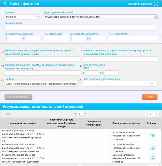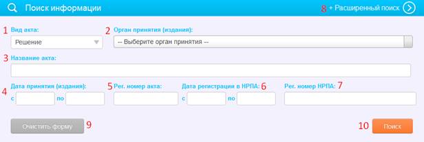 9) кнопка «Очистить форму» – при нажатии на данную кнопку будут очищены все заполненные поля поиска;