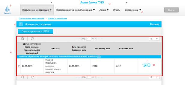 16) поле «ГУЮ, из которого поступили НПА» – в данном поле указывается, из какого ГУЮ следует выбирать НПА.