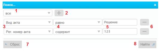 4) условие поиска – в данных полях указывается условие поиска (содержит; не содержит; равно; не равно), в зависимости от которого НПА включается или не включается в результаты поиска;