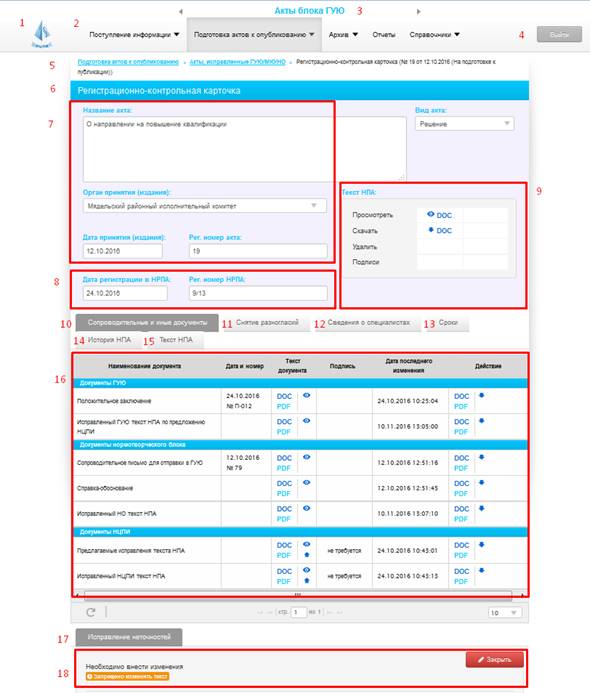 17) вкладка «Исправление неточностей» – на данной вкладке отображаются параметры, заданные при активации признака «Исправление неточностей», а также элементы для исправления текста НПА;