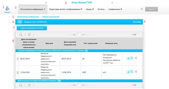 9) файлы НПА – в данной области расположены пиктограммы управления для работы с файлами НПА, а также подписями НПА;
