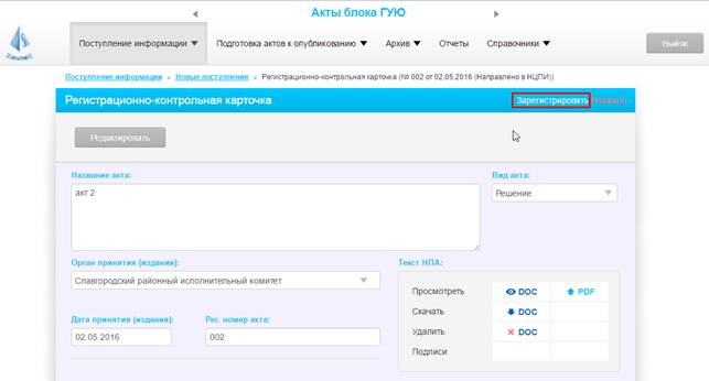 в строке с записью о соответствующем НПА (рисунок 11) или нажать кнопку «Зарегистрировать»