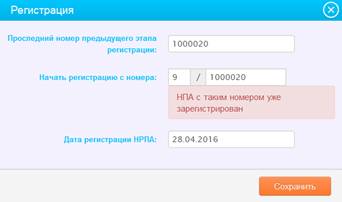 − поле «Начать регистрацию с номера» – по умолчанию отображается номер на единицу больший номера предыдущей регистрации в рамках заданного префикса, при этом возможно указать любой другой необходимый номер регистрации. Если будет введен номер, с которым в НРПА уже зарегистрирован НПА, Система сгенерирует сообщение. При необходимости задайте новые префикс и номер вручную, или нажмите кнопку «Сохранить», для автоматического определения номера регистрации. Система присвоит акту первый свободный номер по порядку, начиная с последнего номера предыдущего этапа регистрации в рамках заданного префикса.