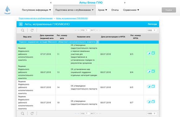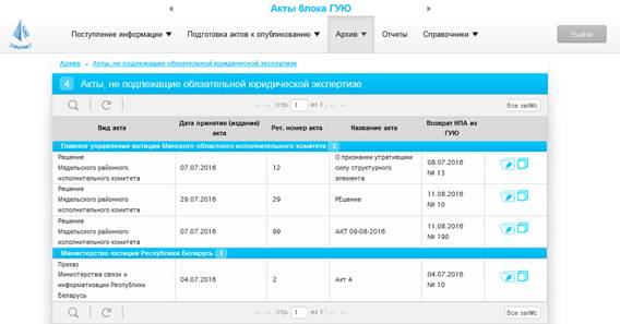 НПА, имеющие по результатам обязательной юридической экспертизы положительное заключение ГУЮ и зарегистрированные в НРПА, отображены на странице «Акты зарегистрированные в НРПА» меню «Архив».