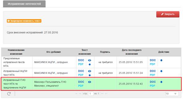 Документ, загруженный от имени пользователя ГУЮ, выделен зеленым цветом, если он соответствует документу, предложенному НЦПИ (т. е. ГУЮ согласился с текстом НЦПИ). Если документ не выделен зеленым, специалист ГУЮ загрузил собственный документ.