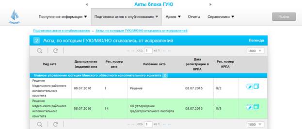 Рисунок 30 – Страница «Акты, имеющие отрицательное заключение ГУЮ/МЮ»