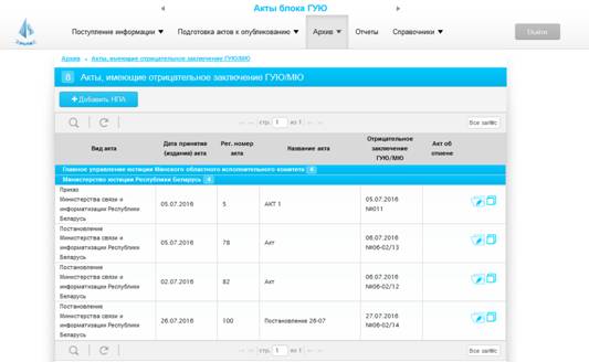 НПА, имеющие отрицательное заключение ГУЮ и не подлежащие регистрации в НРПА, отображены на странице «Акты, имеющие отрицательное заключение ГУЮ/МЮ» в меню «Архив» (Рисунок 30).