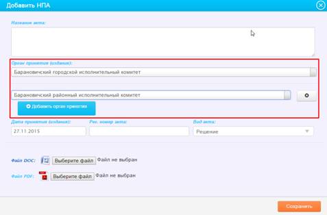 Для добавления дополнительного органа принятия, нажмите на кнопку «Добавить орган принятия», обеспечивающую добавление дополнительной строки для выбора органа.
