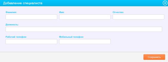 Для добавления сведений о специалисте необходимо нажать на кнопку «+Добавить специалиста». В открывшемся окне укажите сведения о специалисте и нажмите на кнопку «Сохранить» (Рисунок 36).