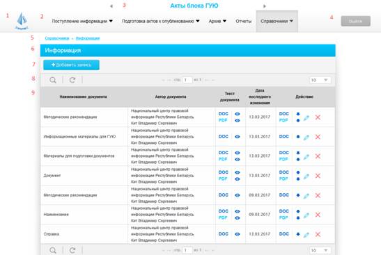 Блок информационных материалов различного характера (разъяснения, методические рекомендации, требования по оформлению представляемых на обязательную юридическую экспертизу НПА, обобщение итогов проведения обязательной юридической экспертизы НПА и т. п.) представлен на странице «Информация» меню «Справочники» (Рисунок 37).