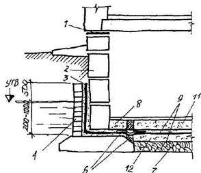 Для защиты стен бесподвальных зданий от капиллярной влаги во всех стенах в цоколе укладывают горизонтальную гидроизоляцию из 2-х слоев толя, рубероида или слоя жирного цементного раствора состава 1:2 толщиной 20-30 мм на 150-200 мм ниже уровня пола первого этажа и на 150 200 мм выше отметки тротуара или отмостки.