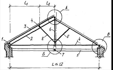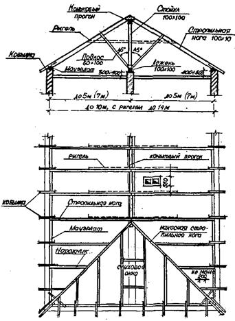 Наслонные стропила из досок, пластин, брусьев, бревен используют для перекрытия пролетов в зданиях с внутренними опорами (см. рисунок).