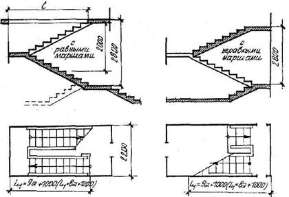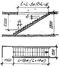 Примечания: 1. внутриквартирные лестницы должны удовлетворять формуле 2b+а=60-64 см; величина 60-64см – размер среднего шага человека. 2. Рекомендуемый уклон лестницы – 1:1,5, что соответствует отношению b:а=16,6:25 (допускается максимальный уклон 1:1,25 см). 3. В скобках даны размеры для уклона 1:1,25. 4. Минимальная ширина марша равна 90 см. 5. высота проходов под лестничным маршем до низа выступающих конструкций не менее 200 см. |