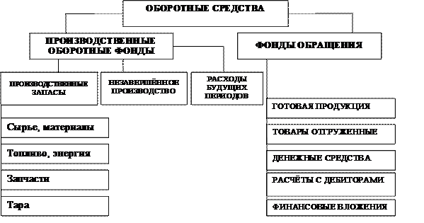 Оборотные средства (ОбС) – это совокупность денежных средств, авансируемая для создания оборотных производственных фондов и фондов обращения, обеспечивающих непрерывный кругооборот денежных средств, и возвращающаяся в исходную форму после завершения каждого оборота. Они обеспечивают весь цикл производства и реализации продукции от заготовки сырья, материалов до реализации готовых изделий. По материально-вещественному признаку в состав оборотных средств включаются оборотные производственные фонды и фонды обращения (рис. 1).