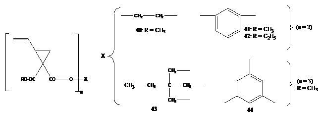Температура стеклования полимеров для стоматологического применения должна быть выше 600С. Однако, заместители, наряду с температурой стеклования, увеличивают и температуру плавления исходных мономеров. Менее вязкими мономерами, способными давать сшитые полимеры нерастворимые в органических растворителях, оказались структуры 40-44 (рис. 20). К тому же некоторые из них (41) показали расширение объема при полимеризации в массе, которое можно объяснить переходом плотной структуры кристаллического мономера в менее сжатую структуру аморфного полимера.