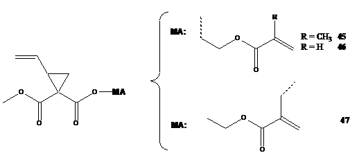 Сшиваемые винилциклопропаны оказались менее реакционноспособны, чем метакрилаты. Поэтому были синтезированы гибридные мономеры (структуры 45-47 на рис. 21), содержащие и винилциклопропильные и метакрилатные группы [48].