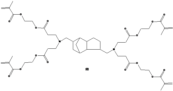 С целью упрощения синтеза были разработаны высоко разветвленные не жидко-кристаллические мономеры для применения в стоматологических композитах. Обычной реакцией Михаэйля при добавлении технического 3,(4),8,(9)-бис-(аминометил)-трициклодекана к 2-(акрилоилокси)этилметакрилату синтезировали разветвленный метакрилат (структура 52 на рис. 24) с молекулярной массой 931 г/моль и вязкостью около 150 мПа×с, полимеризационной усадкой 2,9%, что можно сопоставить с соответствующими характеристиками Bis-GMA (512 г/моль, 1000 мПа×с, 6%).