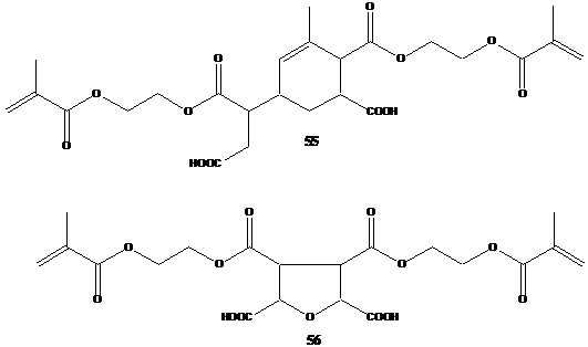 Компомеры являются одним из типов фотоотверждаемых стоматологических пломбировочных композитных материалов, также известных как композитные смолы, модифицированные поликислотами. Термин «компомер», предложенный компанией Dentsply [21], происходит от сочетания слов КОМПОзит и стекло-ионоМЕР и используется для описания безводных, однокомпонентных, светоотверждаемых композитов, содержащих кислотные метакриловые мономеры, армированные силанизированными наполнителями на основе кальций-, стронций - или барий-алюмофторсиликатных стекол, применяемых в стекло-иономерах. Компомеры были разработаны для улучшения физических свойств и клинического применения стекло-иономерных цементов. Один из первых компомеров Dyract содержал в качестве матричного мономера – продукт реакции двух молей 2-гидроксиэтилметакрилата с бутан 1,2,3,4-тэтракарбоновой кислотой, так называемый ТСВ мономер (см. табл.6) [20]. Общей характеристикой структуры предложенных мономеров для компомеров является то, что они содержат в молекуле как метакрилатные, так и кислотные группы [56-58] (см. табл.6 – ТСВ, BPDM, BTDM, STDM, OEMA, OPMA). Кроме этих диметакрилатов алфатических и ароматических тэтракарбоновых кислот, в качестве мономеров для компомеров использовались диметакрилаты циклоалифатических и гетероциклических тэтракарбоновых кислот (структуры 55 и 56 на рис. 25) и олигомерная поли(акриловая кислота), модифицированная глицидилметакрилатом [38, 58] (рис. 25).