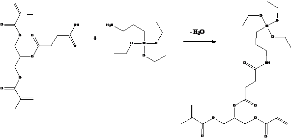 Традиционный синтез ормокеров начинается с функционализации алкоксисиланов полимеризуемыми группами, далее алкоксисиланы гидролизуются и конденсируются, приводя к олигомерным Si-O-Si – нано структурам. Кроме алкоксисиланов, конденсироваться или соконденсироваться могут и другие алкоксиды металлов, такие как титан-, цирконий - или алюминий - алкоксиды. Эти олигомеры замещают традиционные метакриловые мономеры в композитах. Примером метакрилат-функционализированного алкоксисилана стоматологического назначения является продукт реакции (3-изоцианатопропил)-триэтоксисилан (IPTES) с диметакрилатом глицерина (рис. 26) или карбокси-функционализированный диметакриловый алкоксисилан, получаемый реакцией гидроксиэтилметакрилата с 3-(метилдиэтоксисилил)-пропилсукциновым ангидридом (рис. 27) [38].