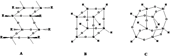 Специальные условия гидролиза и конденсации позволяют получить силсэсквиоксаны – олигомерные кольцевые и кубические Si-O-Si структуры. Силсэсквиоксаны или «Т-смолы» представляют класс соединений с общей эмпирической формулой RSiO1,5. Название происходит от полуторного соотношения кислородных связей к кремнию (sesqui - полтора). Альтернативное название «Т-смолы» является производным от трех (Т) замещенного кремния. Силсэсквиоксаны рисуют в виде трех структур: лестничной (А), кубической (В) и клеточной (С) (рис. 30).