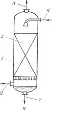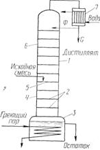 1 - корпус; 2 - тарелки; 3 - куб; 4, 6 - исчерпывающая и укрепляющая части колонны; 5 - питательная тарелка; 7 - дефлегматор.