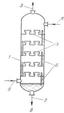 1- корпус; 2 - насадка; 3 - отвод абсорбируемых газов; 4 - ввод абсорбента; 5 - патрубки с колпачками, 6 - сливные трубки; 7 - выход отработанного абсорбента; 8 – ввод абсорбтива (газа).