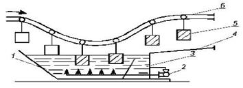 1 - ванна; 2 - насос; 3 - карман; 4 - сточный лоток; 5 - изделие; 6 - конвейер.