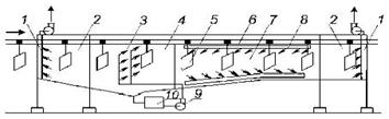 1 - воздушные завесы; 2 - входной и выходной тамбуры; 3 - контур с соплами; 4 - камера облива; 5 - изделие; 6 - конвейер; 7 - паровой туннель; 8 - рециркуляционная вентиляция; 9 - насос; 10 - красочный бак.