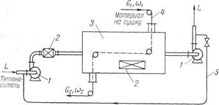 1- вентиляторы; 2 - подогреватели; 3 - сушильная камера; 4 - транспортные приспособления; 5 - рециркуляционная линия.