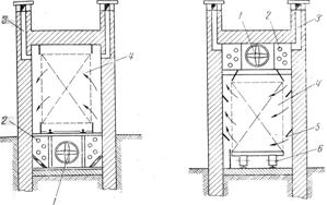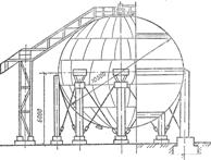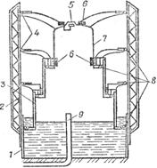 1 - неподвижный резервуар; 2, 3 - на-правляющие: 4 - верхние ролики теле-скопов и колокола; 5 - специальный колпак против образования вакуума; 6 - грузы; 7 - колокол; 8 - нижние ролики телескопов и колокола; 9 - трубопровод.