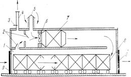 1 - сушильная камера; 2, 3 - шиберы для регулирования расхода воздуха; 4 - вытяжная труба; 5 - жалюзийная камера; 6 - осевой вентилятор; 7 - калорифер; 8 - высушиваемый материал; 9 - двери.