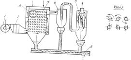 1- вентилятор; 2 - калорифер; 3 - поворачивающиеся полки; 4 - циклон; 5 - рукавный фильтр; 6 - шнек для выгрузки высушенного материала.